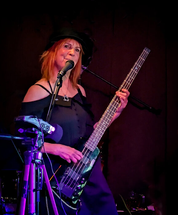 Sharon Paige Wadsworth was born into a Canadian Air Force family, middle of five children and, as is true of most RCAF families, they moved around a lot, eight times in her case, including Trenton, Ottawa and finally Courtenay BC. Her parents listened mostly to country music, such as Jim Reeves, Patsy Cline, Loretta Lynn and Hank Williams. Her mother played piano and grandfather played fiddle. Sharon's older sister, Vicki, was an influence on her listening as a teen, Beatles, Everly Brothers, Hollies, harmony rock and Sharon also liked Suzi Quatro as a strong female lead who played bass. Her Dad gave her a guitar and she taught herself folk oriented songs. After graduating from UVIC, Sharon and a friend spent a summer travelling in Europe and on her return she moved to Victoria. In the mid 70s, she met John Fisher and they became a couple. John was teaching himself guitar, having long experience on bass and Sharon started playing bass. She said, "I really wanted to be involved in music. If my partner was playing, I knew I wanted to be playing with him." Soon they formed Honey Bee, an excellent blues band that also featured Derek Walsh on vocals and harp. New at the time, Sharon said, "I knew nothing about playing with a drummer." Bass players Sharon was influenced by included John (obviously), Jack Bruce, Rolling Stones, Muddy Waters, Hound Dog Taylor, Brewer Phillips, Willie Dixon and Duck Dunn. "I liked the old raw authentic blues". Over time, Honey Bee morphed into Off The Wall and finally Elmore's Bar & Grill. In Elmore's, Sharon started singing some songs too. Her preference ran towards more girly voiced singers than belters, as suited her voice, twangy country, Memphis Minnie, Marcia Ball, Lou Ann Barton and Sue Foley. The band gigged constantly, even though Sharon and John both had full-time jobs and two children! They were busy!! Some of their gigs included UVIC, the Barbary Coast, The Fernwood Inn (where they hosted what became a very long running and popular jam), Hermann's, Steamers, Bartholomew's, JBI, Central Bar & Grill and lots on gulf islands and around the island. Sharon was very involved in the booking and organisation of the band, jams and notably the 16 year run of R&B Festivals which were hugely successful, raising money for charity, notably the NEED Crisis Line. After John passed in 2017, Sharon fronted her own band called SP & Johnny's Rhumba Kings with Dave Harris and Charles Gates, in memory of John. She was also involved in the very successful run of gigs as The Hip Shake Collective at Cup of Joe, McDonald Park and Ross Bay Pub. She often played washboard in those gigs, or sang and played bass. Elmore's Bar & Grill carried the torch for the blues throughout their career, notably in the '90s and 2000s. She is "The First Lady of Victoria Blues"!!