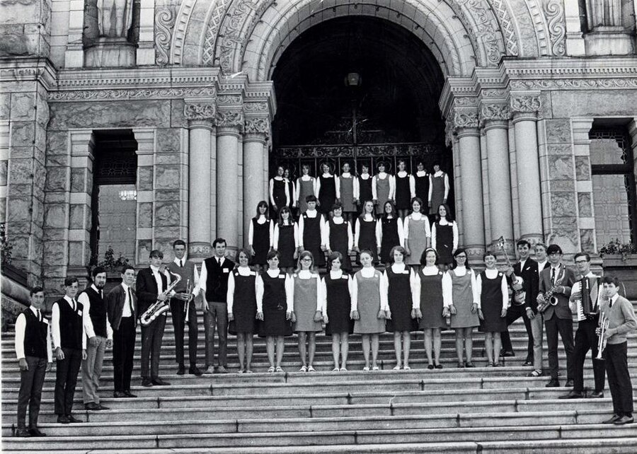 This was a huge group with many pople coming and going over the years, but it maintined a fairly solid core group of people. The group played some of Victoria's major venues, such as the Newcombe Auditorium, The MacPherson Playhouse, The Royal Theatre and Butchart's Gardens. The group was a regular performer at Butchart's, playing every second night throughout the summers in the late 60's. After the group ceased to be, many of the very talented musicians formed the Big Band, a nostalgia group playing jazz and music of the 40's and 50's. It was also a great place to meet girls! George K.