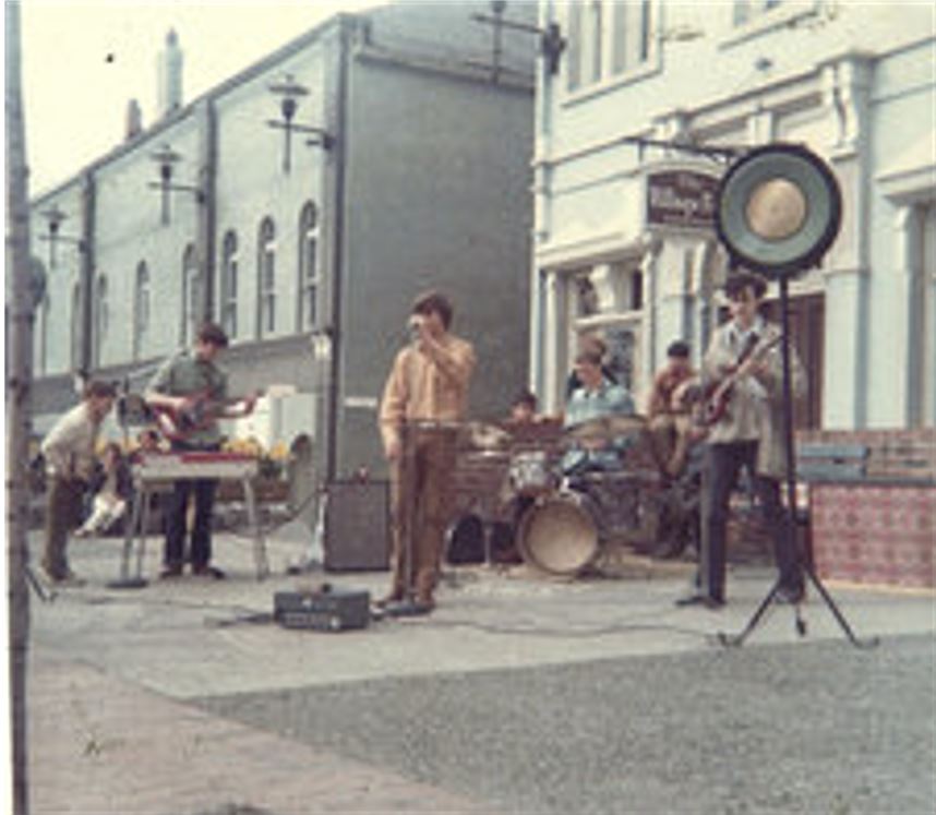 Photograph taken in Bastion Square during 1969 by Glen Mofford of the local band, Sad Bird - had no other information.