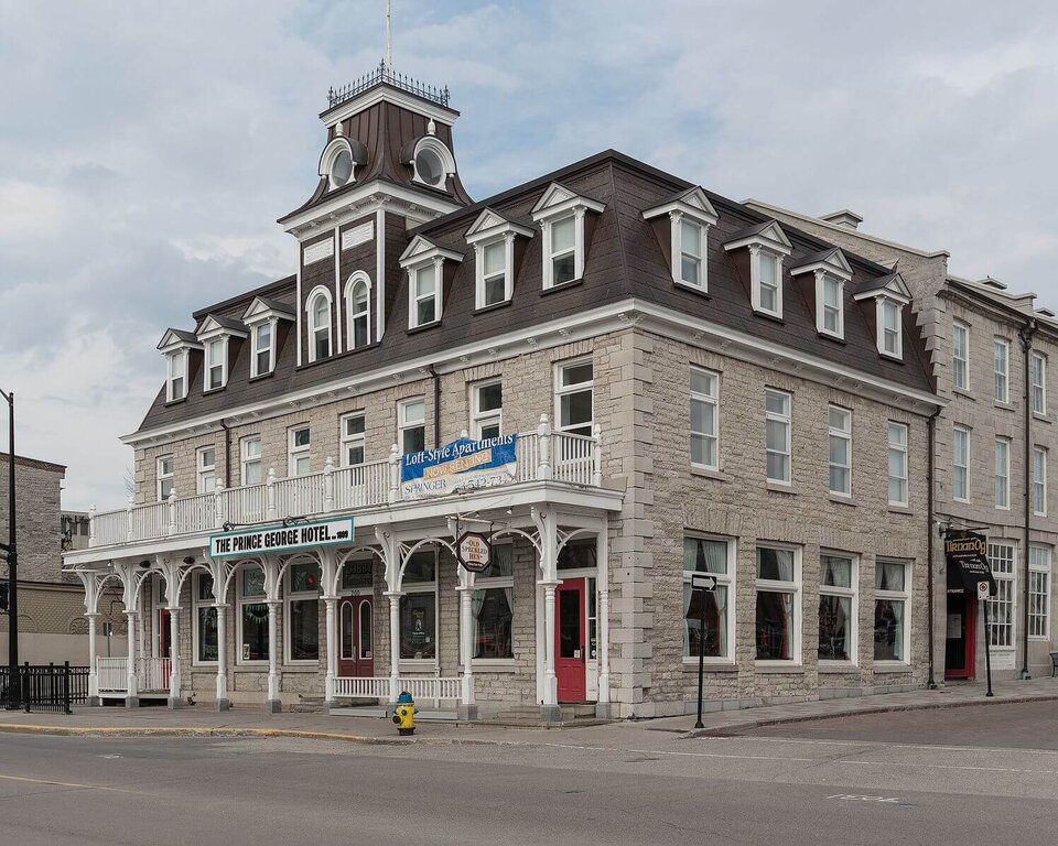 Just off Springer Market Square, the Prince George Hotel heritage site dates back to 1809 and is composed of several limestone commercial buildings that were unified by one facade in 1892. The upper part of the main facade is in the Second Empire style and features a mansard roof and tower with decorative ironwork and a one-storey verandah with balcony. The building has housed various businesses in its lifespan, including shops, warehouses, saloons, and an inn that has recently been converted to loft apartments.