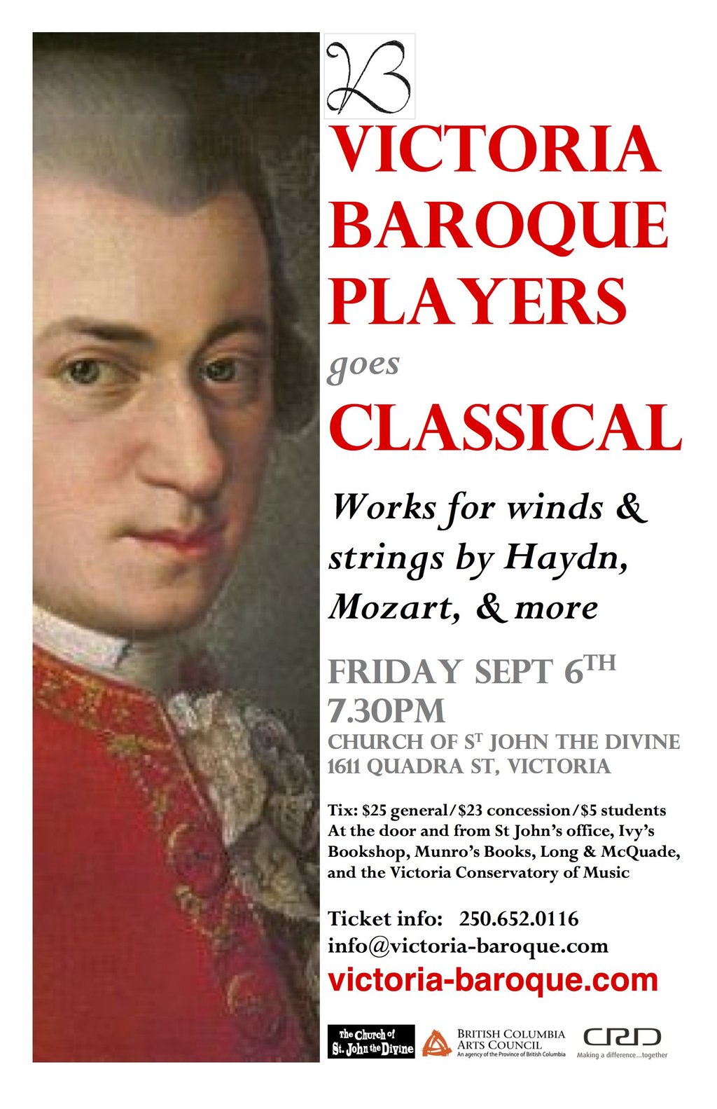Known for its spirited high-quality performances, the Victoria Baroque Players continues to bring its audiences new musical delights and discoveries. The first concert of their third season combines chamber works for winds and strings by Mozart and Haydn, as well as gems from lesser-known masters, culminating in an 18th-century transcription of Haydn's joyous Symphony No. 97. Played on copies of the 18th-century instruments.