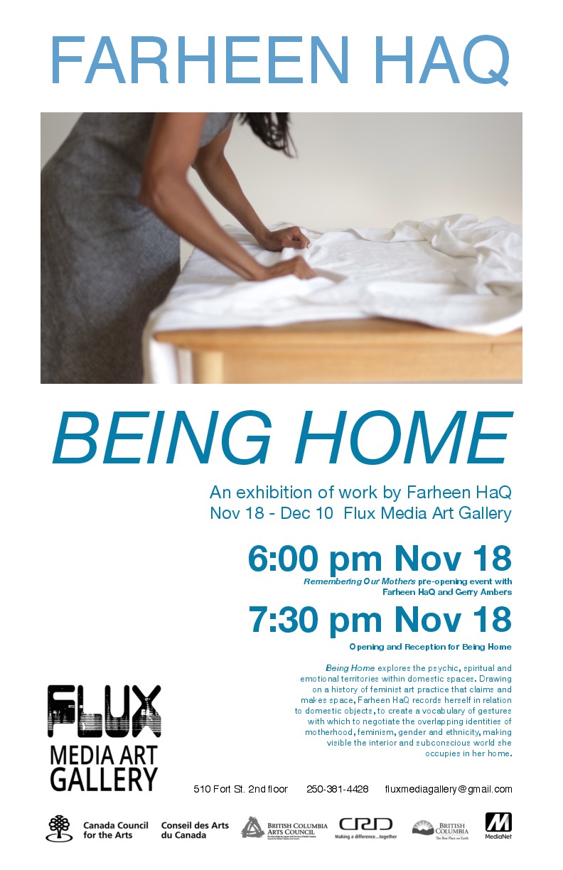 Being Home explores the psychic, spiritual and emotional territories within domestic spaces. Drawing on a history of feminist art practice that claims and makes space, Farheen HaQ records herself in relation to domestic objects, to create a vocabulary of gestures with which to negotiate the overlapping identities of motherhood, feminism, gender and ethnicity, making visible the interior and subconscious world she occupies in her home.