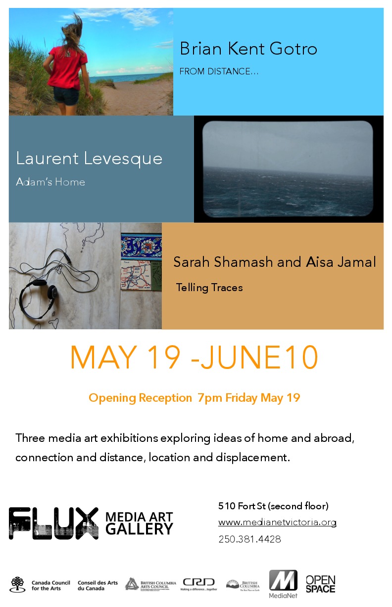 Three media arts exhibitions by artists from the US and across Canada: Brian Kent Gotro's FROM DISTANCE... (Toronto), Laurent Levesque's Adam's Home (Seattle) and Telling Traces by Sarah Shamash and Aisa Jamal (Vancouver). These exhibitions explore ideas of home and abroad, connection and distance, location and displacement, and incorporate video projections, sound installations, and internet art.