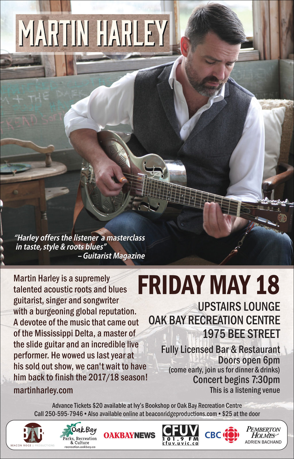 Martin Harley is a supremely talented acoustic roots and blues guitarist, singer and songwriter with a burgeoning global reputation. He’s a devotee to the music that came out of the Mississippi Delta, the slide guitar, and many other forms of roots music. Though Harley’s sound is rooted in the blues it seeks to tell his own story and draws on the ruminations of a musician who has spent much of his life on the road.