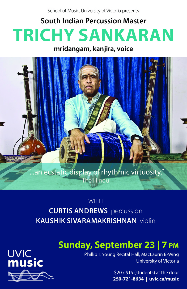 South Indian Percussion Master: Trichy Sankaran  (mridangam, kanjira, voice), Curtis Andrews (percussion), Kaushik Sivaramakrishnan  (violin) @ Phillip T. Young Recital Hall (Uvic) Sep 23 2018 - Feb 2nd @ Phillip T. Young Recital Hall (Uvic)