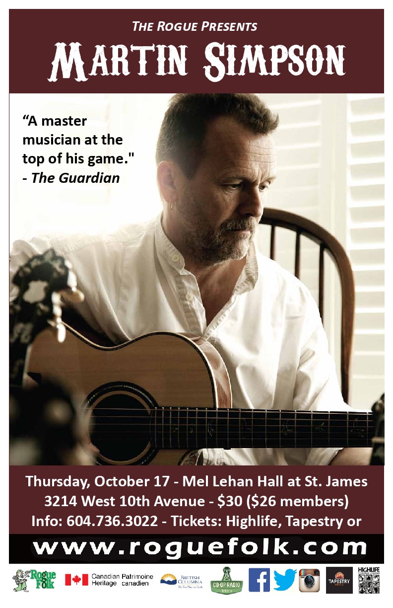 Widely acknowledged as one of the finest acoustic and slide guitar players in the world, Martin Simpson’s interpretations of traditional songs are masterpieces of storytelling. Whether playing American old-time music, blues, a Dylan song or his own material, Martin Simpson is unpredictable, individual and a guitarist of immense subtlety.
