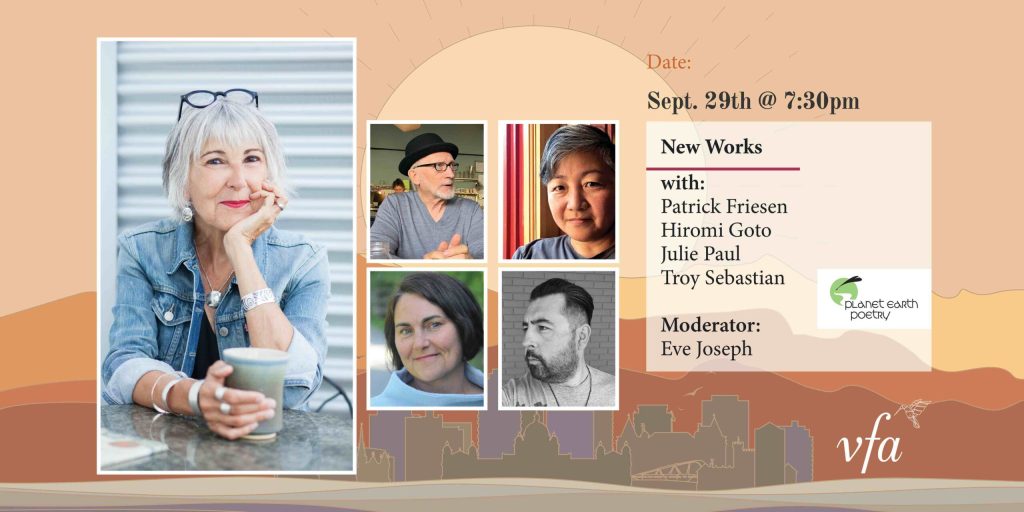 Have you ever wished you could lean over the desk of one of your favourite authors, stealing a peek at an early draft? Now you can. Four of Victoria’s finest writers—Patrick Friesen, Hiromi Goto, Julie Paul, and Troy Sebastian |nupqu ʔak·ǂam̓—are offering you a glimpse of their unpublished manuscripts. Two will share writing in genres that are new to them, the others in genres they’re known for. There will be poetry and prose, polished drafts and early ones, but the readings will be similar in that they will be your only chance. By the time these words appear in book form, they’ll be altered.