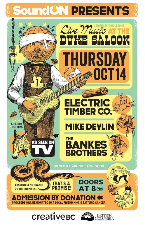 The Electric Timber Co., The Bankes Brothers, and Mike Devlin at the The Duke Saloon. With a special lighting show donated by Pacific Audio Works, that will be curated by Michael Franzmann and Simon Rishman. Doors are at 8, with admission by donation being collected via Odd Fellows - Columbia #2 Victoria BC. All proceeds collected will going directly to a close friend battling cancer.