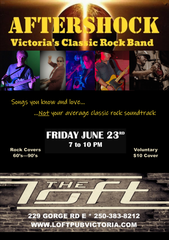 AfterShocK is a 5-piece Classic Rock Cover Band from Victoria B.C. AfterShocK is: Delia Bilhete - Vocals Mike Hogg - GuitarDean Caplan - Keyboards Tom Sherk - Bass Gregor Kowalski - Drums. AfterShocK cover popular danceable tunes that keep the dance floor alive by artists such as April Wine, Foreigner, Pat Benatar, Styx, Journey, Trooper, Fleetwood Mac, Queen, Bryan Adams, Toronto, Lenny Kravitz, Lynyrd Skynyrd, Led Zeppelin etc………! Voluntary Cover $10