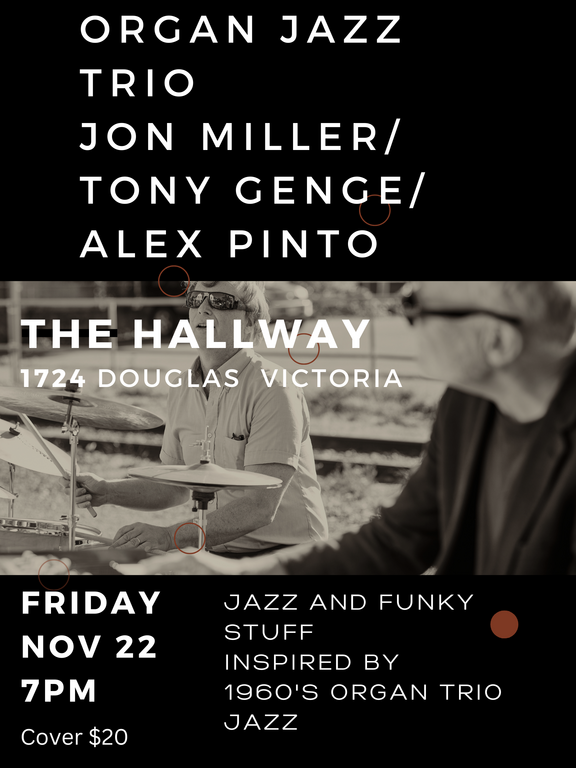 The Jon Miller Trio featuring Alex Pinto (guitar), Tony Genge (organ) and leader Miller on drums will play at The Hallway restaurant (formerly Northern Quarter) on Friday November 22nd at 7pm. Audience members can expect an evening of jazz standards and funky stuff in the vein of 1960's organ jazz from this fabulous combo. Not to be missed!