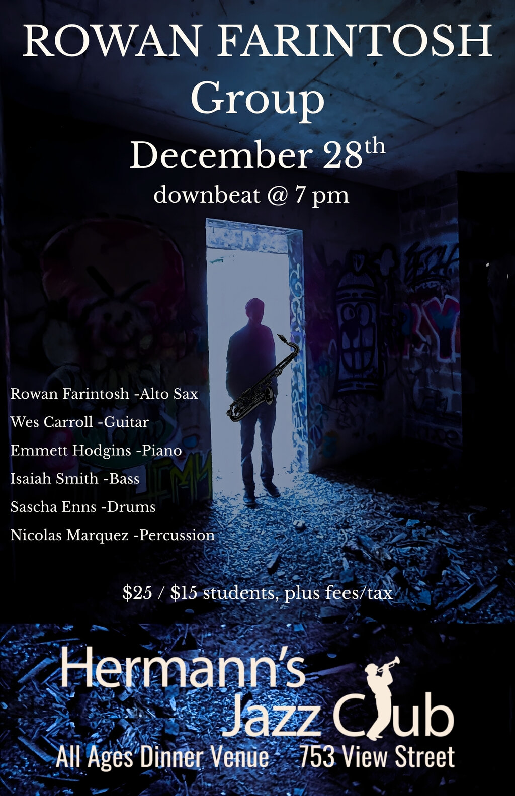Rowan Farintosh is an award-winning saxophonist and composer based in Victoria, BC. With a diverse set of musical influences (Roy Hargrove, Stevie Wonder, Radiohead, Bon Iver, etc.), he composes music containing a wide variety of sonic tapestries that can connect with fans of jazz, R&B, ambient, and progressive genres. In addition to leading projects in various configurations, Rowan takes pride in being a top call studio saxophonist for numerous projects in the Victoria area, as well as performing for corporate events and wedding ceremonies. After winning the Lou Williamson scholarship, Rowan moved to Toronto to attend the prestigious Humber College, where he studied with many of Canada's top jazz musicians, including Alex Dean and Kirk MacDonald. Rowan currently resides in Victoria, BC and is working towards recording his original music and showcasing his talents across the world.