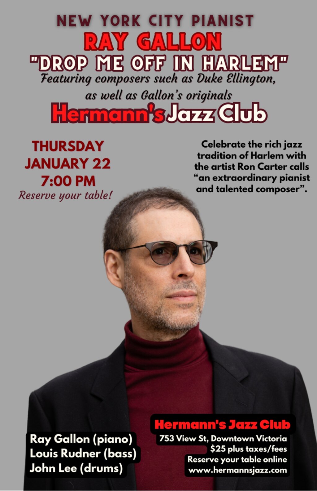 Celebrate the rich musical legacy of Harlem with renowned NYC pianist Ray Gallon in support of his trio album with legendary bassist Ron Carter and drum master Lewis Nash, “Grand Company”, available on Cellar Music. “Drop Me Off in Harlem”, the opening track on the album, is Ray’s arrangement of this classic Duke Ellington song, composed in 1933 during the Harlem Renaissance, soon after Ellington concluded his long residency as musical director of the famed Cotton Club.