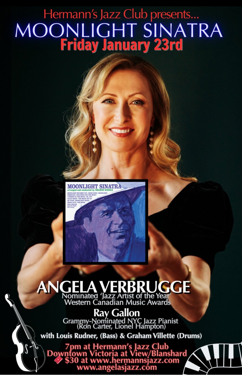 Let the timeless charisma and romantic storytelling of Frank Sinatra’s repertoire warm a Vancouver Island January evening. Hermann’s Jazz Club invites you to a special concert with acclaimed jazz vocalist Angela Verbrugge, back from fall tours to Europe and Asia. Verbrugge was nominated for Jazz Artist of the Year at the 2024 Western Canadian Music Awards and recently topped both the All About Jazz and JazzTimes polls.