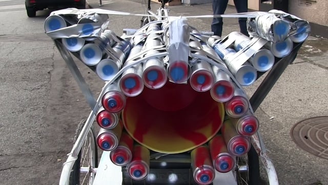 TRANSITRON 2000 is a mobile sculpture made of 150 spray paint cans made by Sam Sharp for the PedalBox Gallery.