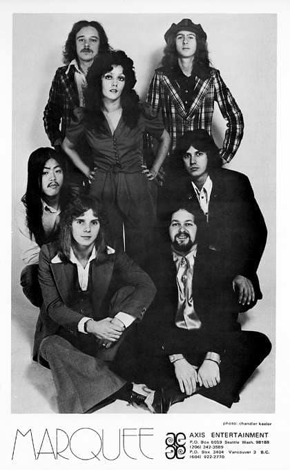 Marquee. Cheri Beck (my mom in the middle). Michael Kasper (top left bass player-my step dad ❤) , Randy Demeres drums (top right), Gerry Andrews Hammond keyboard (bottom right), Rick ? singer/guitar (bottom left), Tom Nishamira saxaphone (middle left), can't remember the name of middle right anymore (Ed?). I was in elementary school while this band was in full swing. They used to play all the way from Oil Can Harry's and Lasiter's Den up to The Prince Rupert Hotel. I used to go on the road with this band as a kid. Fun Times. Great memories. Melody Kientopp