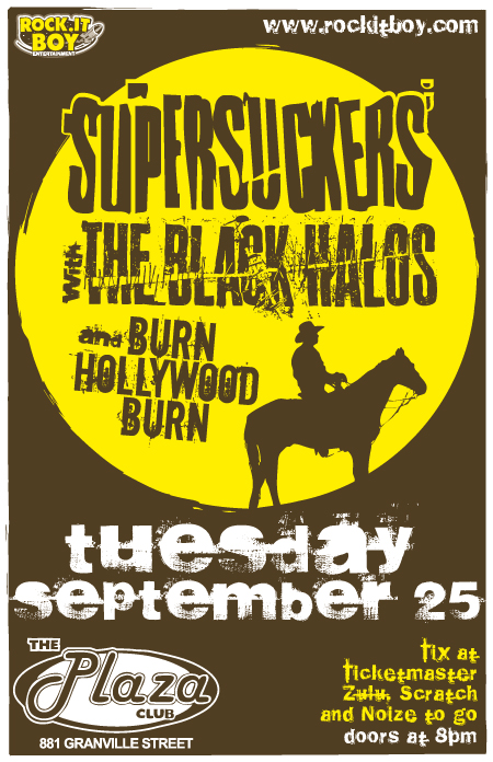 Take cover boys and girls, it’s that loveable foursome from Tucson, Arizona. Rock.It Boy Entertainment takes pride in presenting SUPERSUCKERS, the band that bills itself as “the greatest rock band in the world,” in concert with special guests THE BLACK HALOS and BURN HOLLYWOOD BURN on Tuesday, September 25th at the Plaza Club in Vancouver. Advance tickets are available for $18 at Zulu, Noize and Scratch Records and all Ticketmaster outlets.