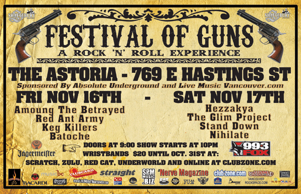 The Nerve Magazine and SPM MUSIC proudly present the 6th Annual Festival of Guns, “A Rock ‘n’ Roll Experience” showcasing some of Vancouver’s best musical talent from the Indie, Rock, Punk and Metal scenes. Since its debut in 2002, “Festival of Guns” has become Vancouver’s definitive indie rock festival featuring new and established talent from the Pacific Northwest. Festival of Guns 2007 is taking place over 4 days from November 15-18, 2007, highlighting over 70 bands with 21 showcases in venues such as; The Plaza Club, The Media Club, The Red Room, The Bourbon, The Railway Club, Pub 340, The Royal Unicorn, Malones, Library Square, The Astoria and The Penthouse. In true festival style, all venues are within walking distance of each other.