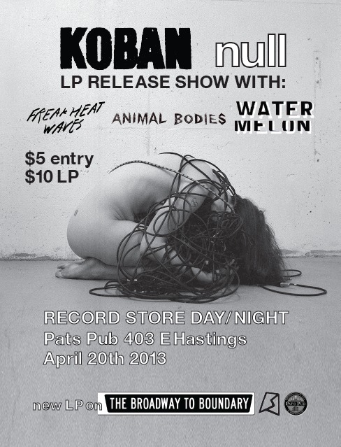 KOBAN releases their debut LP "null" on RECORD STORE NIGHT, SATURDAY, APRIL 20th, at the cheap/friendly Pat's Pub with ANIMAL BODIES, WATERMELON, and FREAK HEAT WAVES.