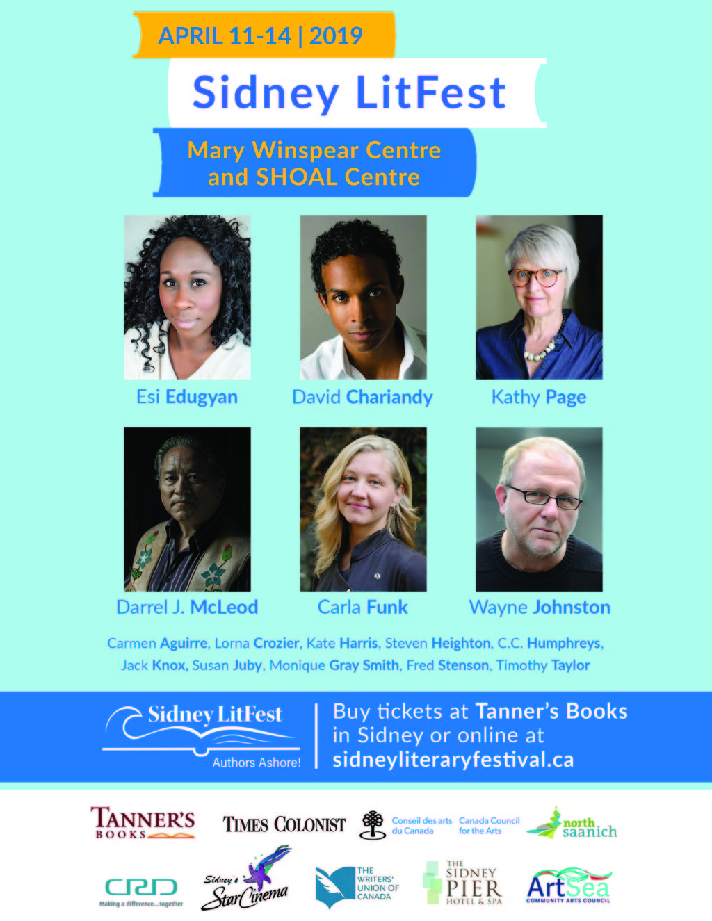 The 2019 Sidney LitFest, which runs April 11-14, will feature 16 Canadian authors at eleven different events, including panel discussions, readings and writing workshops. Held on alternate years, this is the fourth Sidney festival “for readers and writers” who enjoy the seaside location and the chance to learn about authors they may not have read yet. Book lovers can choose from authors of mysteries, crime, plays, poetry, novels and non-fiction. Amongst the line-up are a number of authors whose work has been recognized by major Canadian book awards.