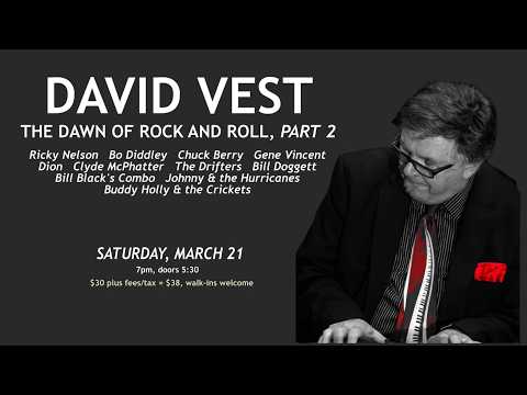 David Vest and his red-hot band have been revisiting The Dawn of Rock and Roll this year. Part 1 (in January) looked at artists on the Sun Records label. Part 2 takes a wider view, with music by Ricky Nelson, Bo Diddley, Chuck Berry, Gene Vincent, Dion, Buddy Holly, Bill Doggett and others who rocked the world at about the time David got going himself.